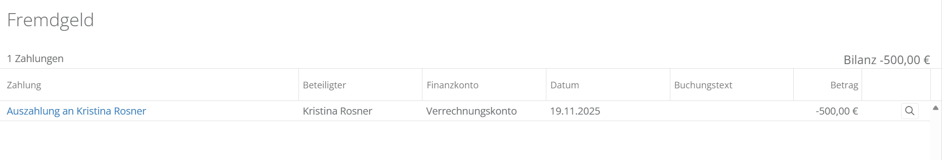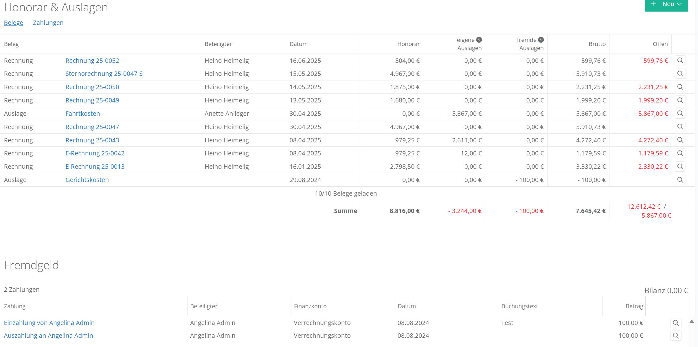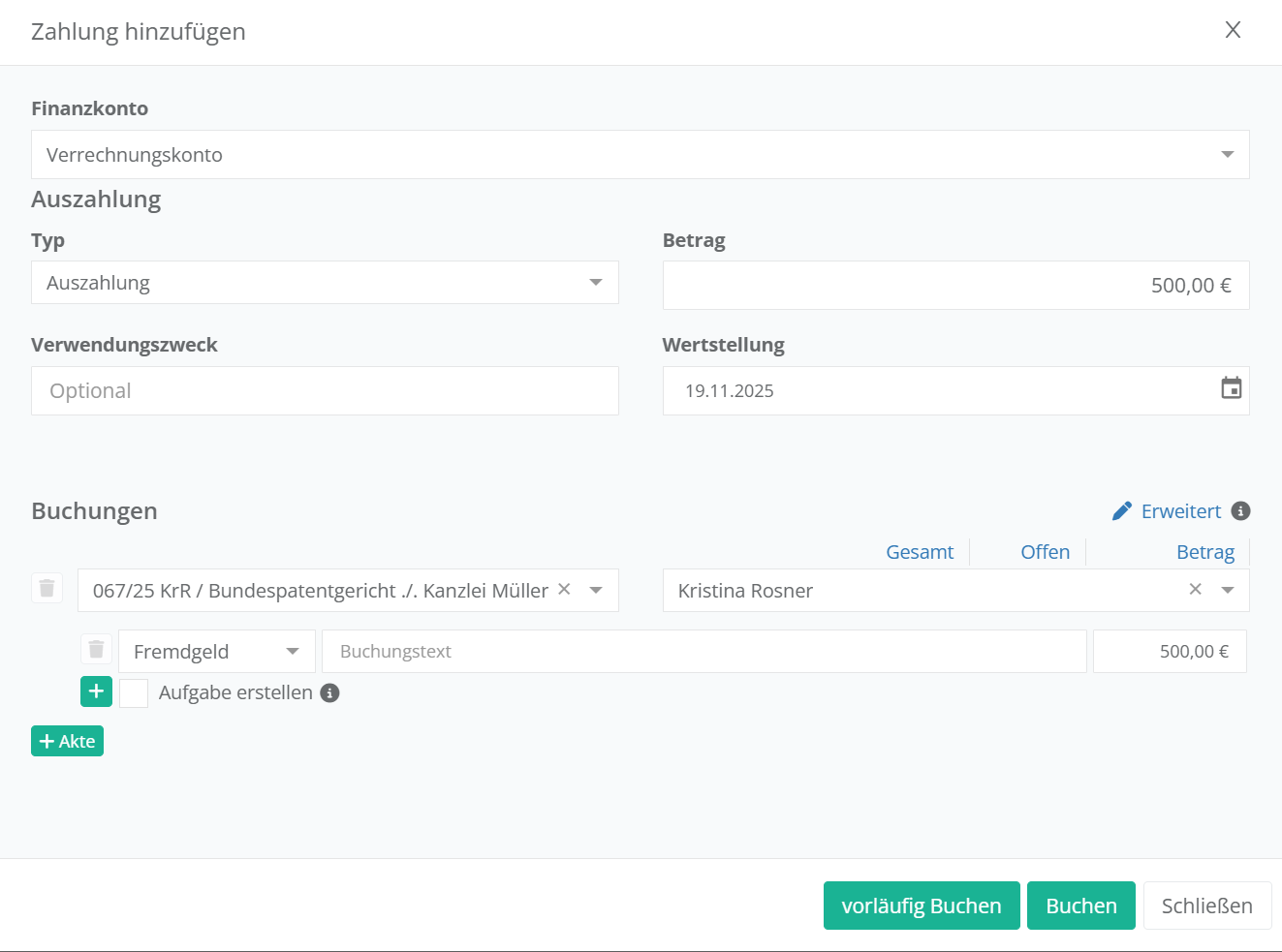 Fremdgeldzahlungen sind für die Verwaltung von fremden Geld geeignet. Sie werden nicht in der Betriebs-Buchhaltung berücksichtigt, aber beeinflussen die Fremdgeldbilanz einer Akte. Am Ende des Tages sollte die Fremdgeldbilanz ausgeglichen sein.
