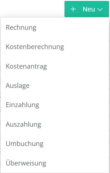 Von hieraus können Sie verschiedene Funktionen und Aktionen auslösen. Navigieren Sie dafür zum grünen Button „+ Neu“ in der oberen rechten Ecke. Dort finden Sie eine Auswahl an möglichen Aktionen: