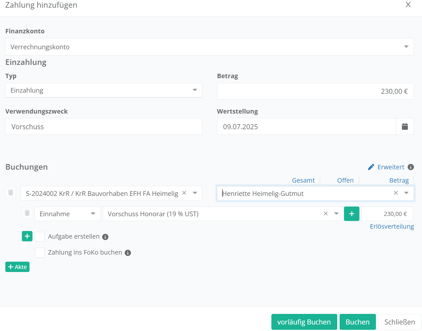 Die Einzahlung wird dann in der jeweils anderen, ausgewählten Akte, auch vermerkt.