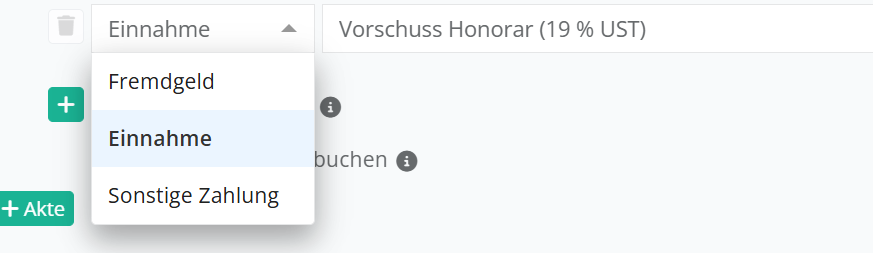 Mit dem Klick auf den grünen Button „+ Akte“ können Sie die Einzahlung auf eine weitere Akte aufsplitten. Eventuell betreuen Sie einen Mandanten parallel in mehreren Verfahren. Wenn er Ihnen eine Abschlagssumme überweist, können Sie diese auf mehrere offene Forderungen bzw. Rechnungen in verschiedenen Akten aufteilen.