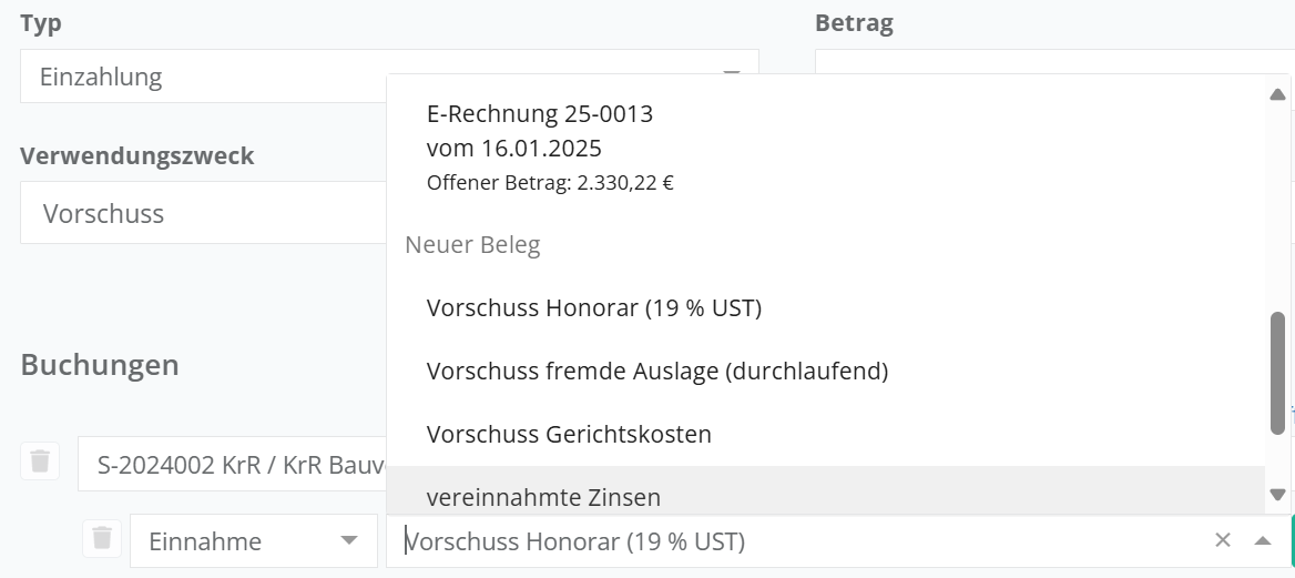 Wählen Sie zudem die korrekte Kategorie der Einzahlung aus. Wenn es sich um die Zahlung einer bereits gestellten Rechnung (oder auch nur einer Teilzahlung handelt), können Sie den zugehörigen Rechnungsbeleg auswählen.