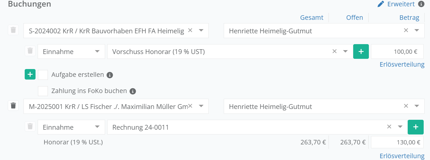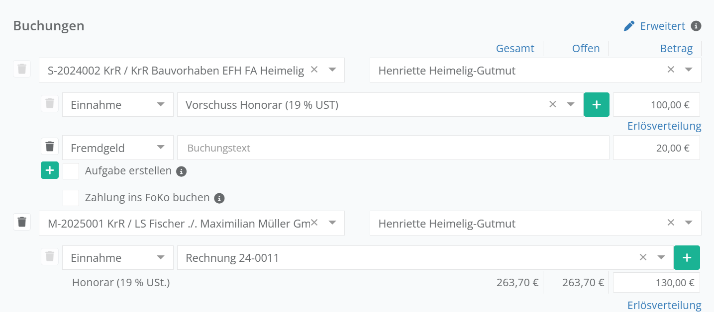 Mandantin Henriette Heimelig-Gutmut hat eine Zahlung in Höhe von 250 Euro getätigt. Aus dieser Zahlung entfallen für die Akte S-2024002 100,00 Euro Betriebseinnahme und 20,00 Euro Fremdgeld. Zudem deckt die Zahlung einen Teilbetrag eines offenen Betrags aus einer anderen Akte ab, in der sie ebenfalls als Mandantin auftritt. Der restlichen Betrag – 130,00 Euro – kann also als Teilzahlung auf die offene Rechnung in der Akte M-2025001 verbucht werden.