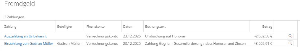 Nach Bestätigung der Umbuchung finden Sie im Aktenkonto im Bereich „Fremdgeld“ sodann die Umbuchung als Auszahlung vom Fremdgeld.