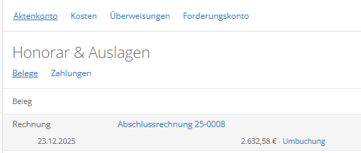 Im Bereich „Honorar“ wird außerdem der ausgewählte Rechnungsbeleg als bezahlt ausgewiesen und mit einem Klick auf den Rechnungsbeleg können Sie nachvollziehen, wodurch die Rechnung beglichen worden ist (hier z.B. durch Umbuchung vom 23.12.2025).