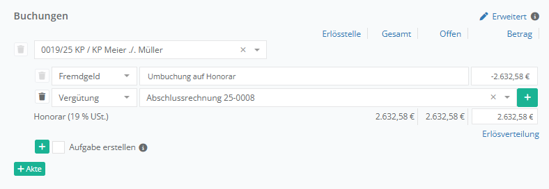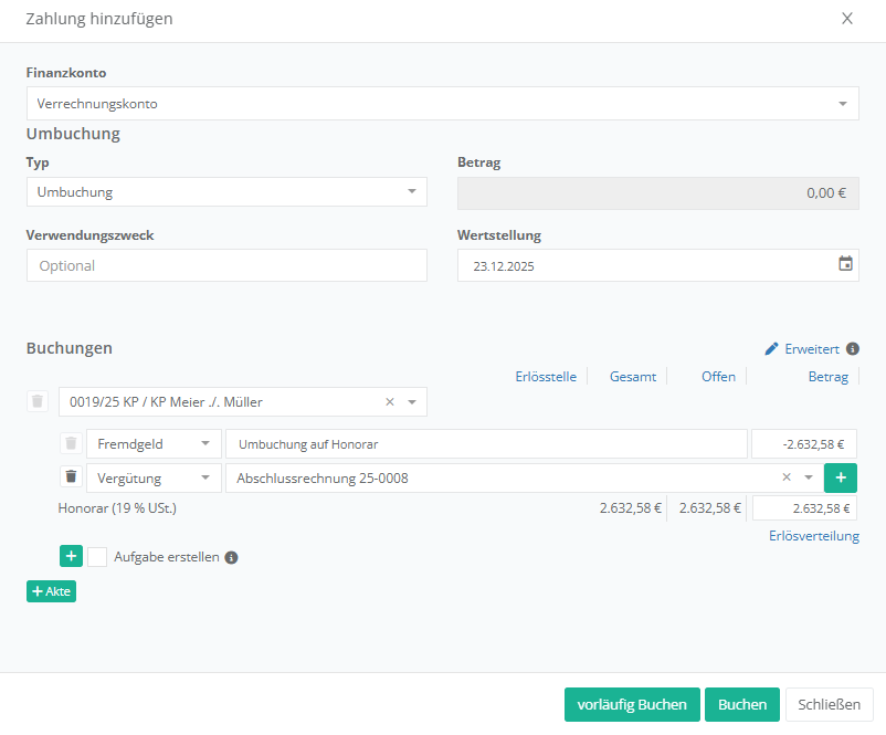 Wollen Sie eine Umbuchung von Beträgen innerhalt des Aktenkontos vornehmen, können Sie über den Unterpunkt „Umbuchung“ bspw. einen eingezahlten Betrag auf eine andere Position umbuchen. Hier ein Beispiel eines ursprünglichen Fremdgeldeingangs, welcher auf das anwaltliche Honorar verbucht werden soll: