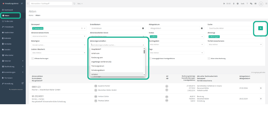 Zudem können Akteneigenschaften als Filter bei der Aktenauswahl genutzt werden. Navigieren Sie hierzu in der linken Hauptnavigation zu „Akten“. Klicken Sie dann auf die Option zur erweiterten Suche (grüner Button mit weißem Doppelpfeil rechts) und wählen Sie eine oder mehrere Akteneigenschaften aus, um den Aktenbestand dementsprechend zu filtern.