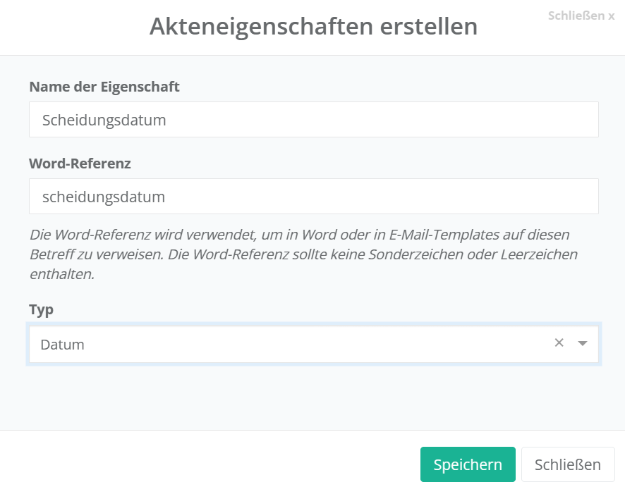 2. Wählen Sie einen Namen für die Word-Referenz, um in Word-Vorlagen oder E-Mail Templates darauf zugreifen zu können. Tipp: Es empfiehlt sich, der gleiche Name, wie in der Akteneigenschaft in Kleinschreibung, zusammengeschrieben (keine Leerzeichen) und ohne Sonderzeichen. Bei vielen ähnlichen Akteneigenschaften kommen Sie durch dieses Vorgehen nicht durcheinander