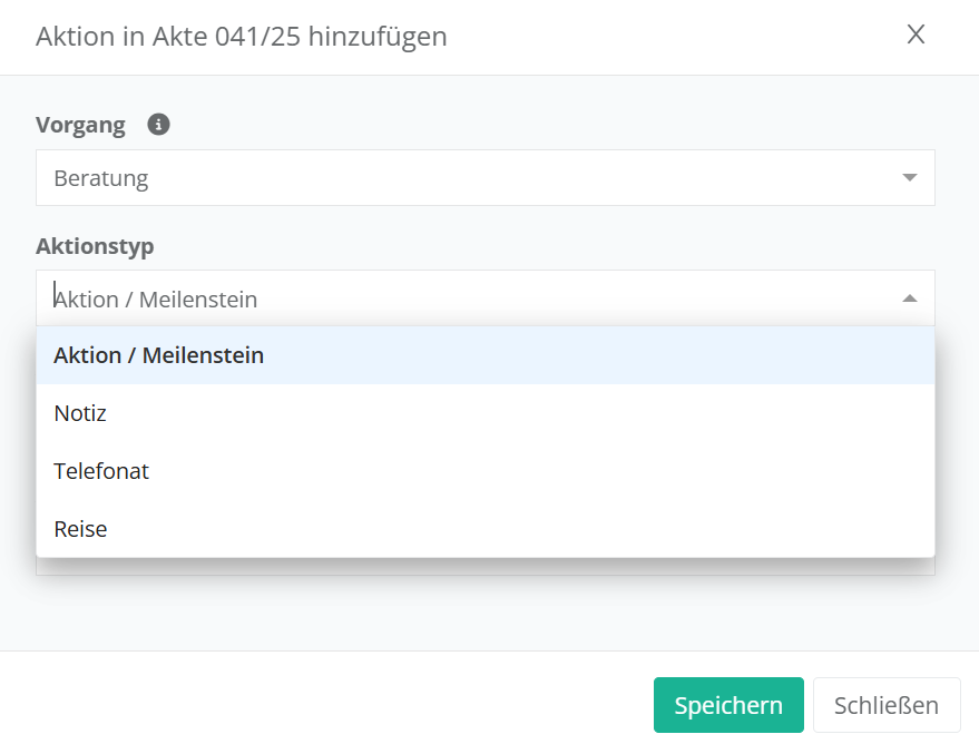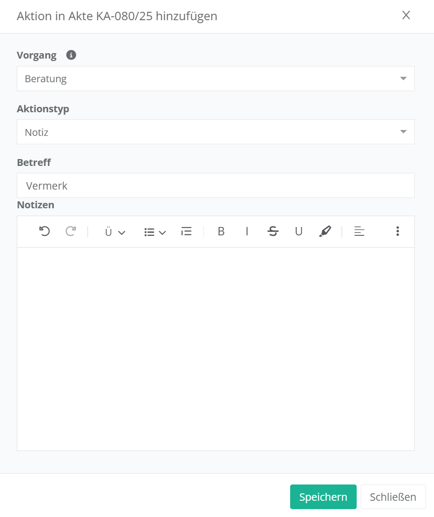 Über das nun erscheinende Fenster können Sie ebenfalls als Aktionstyp „Notiz“ oder „Telefonat“ auswählen, um das gleiche Fenster zu öffnen, in dem Sie dann Vermerke notieren können.