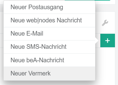 Navigieren Sie zum Korrespondenz-Panel in der Akte. Klicken Sie auf das grüne Plus-Symbol. Wählen Sie „Neuer Vermerk“ aus.