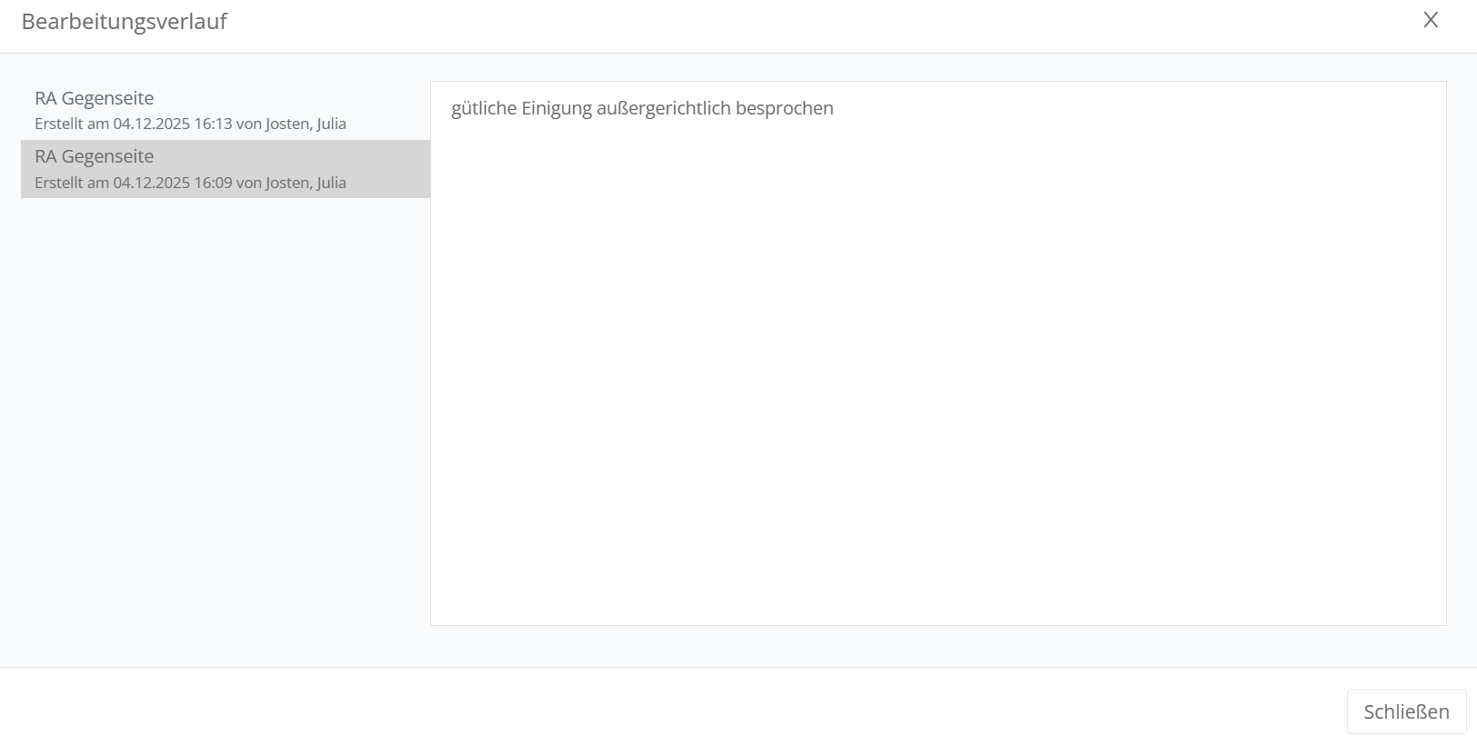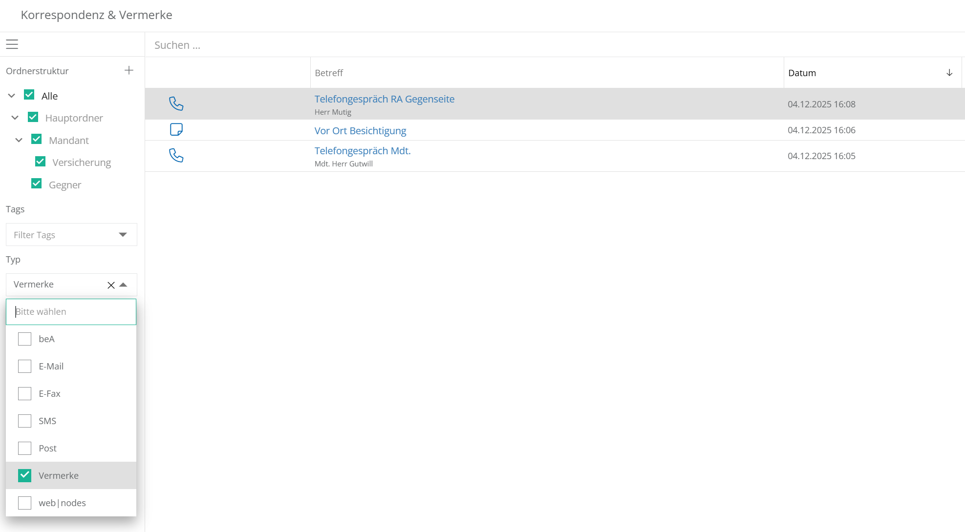 Zudem wird automatisch jeder Vermerk als Korrespondenz chronologisch im Korrespondenz-Panel abgelegt. Hier kann auch nach Vermerken gefiltert werden.