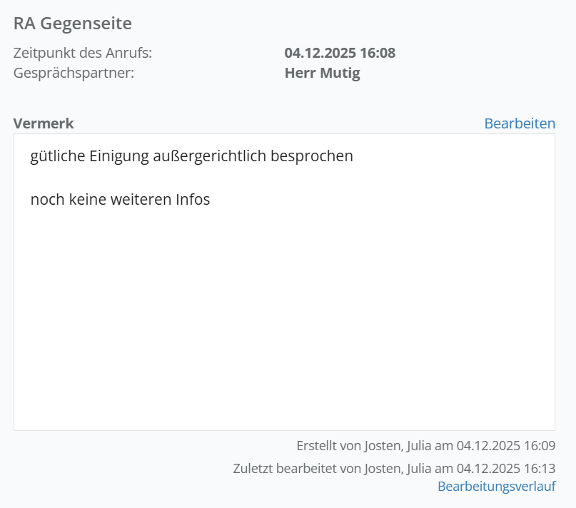 Tragen Sie hier eine interne Betreffzeile für den Vermerk ein, z. B. „Mandantengespräch bzgl. Vergütung“