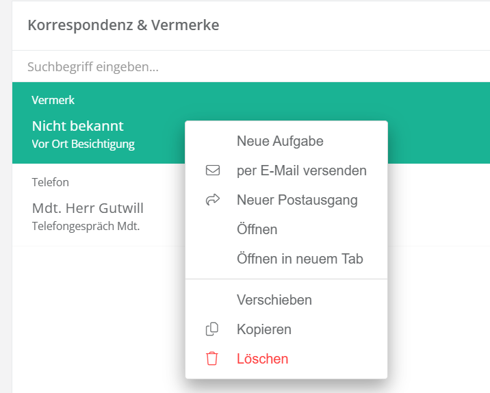 Mit Rechtsklick auf einen Vermerk im Korrespondenz-Panel kann ein Eintrag auch gelöscht werden. Der Vermerk verbleibt dennoch in der Timeline, sodass die Inhalte revisionssicher an der Akte gespeichert bleiben.