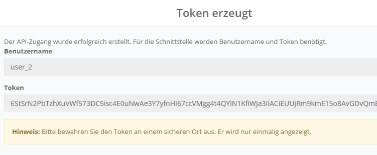 Es wird daraufhin ein Token erzeugt, der einen Benutzernamen und eine Token-ID anzeigt.