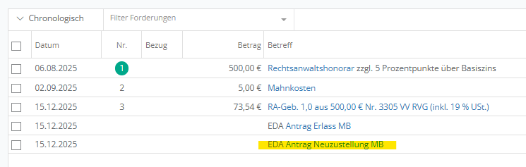 Im Forderungskonto finden Sie nun auch automatisch die Angabe, dass ein Antrag auf Neuzustellung des Mahnbescheids erstellt wurde. Durch Anklicken des EDA Antrags können Sie jederzeit Ihre gemachten Angaben nachprüfen.