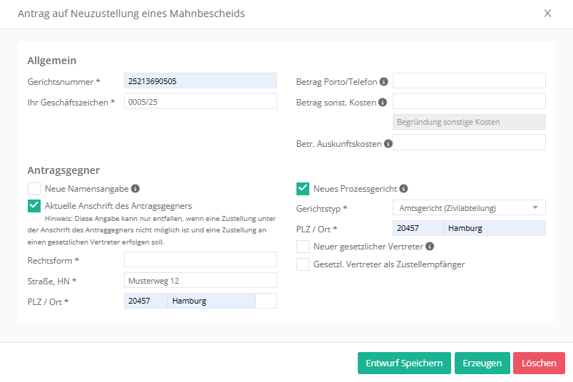 • Antrag auf: Neuzustellung eines Mahnbescheids