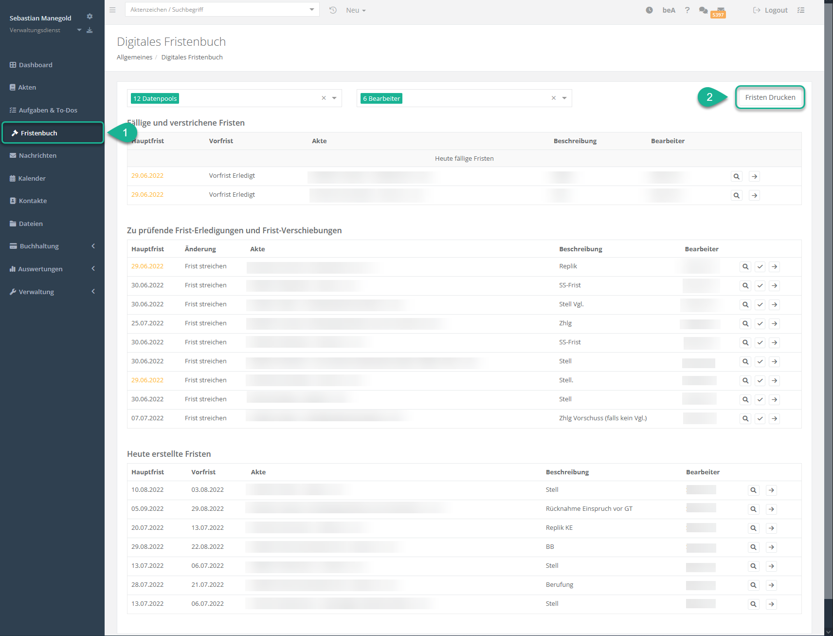 - Öffnen Sie zuerst das Fristenbuch über den Eintrag „Fristenbuch“ (1) in der linken Seitenleiste.