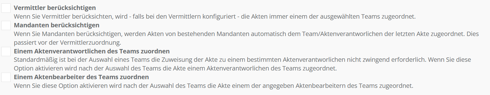 3. Wählen Sie (optional) aus, welchem Team bzw. Teams (Mehrfachauswahl möglich) die neue Akte über diesen Verteilungsschlüssel zugeordnet werden soll. Wenn Sie keine Team-Auswahl hier treffen, wird automatisch dasjenige Team gewählt, welches in den vergangenen Tagen am wenigstens neue Mandate zur Bearbeitung zugewiesen bekommen hat.