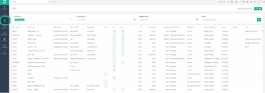 Sie finden die Übersicht über alle Ihre Akten links in der Hauptnavigation unter dem Menüpunkt: Akten. In dieser Ansicht haben Sie Zugriff auf all Ihre Akten.