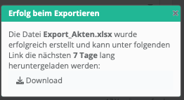 Nach einer gewissen Ladezeit erscheint im oberen rechten Bildschirmrand ein Pop-Up Fenster mit einem Download-Link, unter dem Sie Ihre Export-Datei im Excel-Format 7 Tage lang downloaden können.