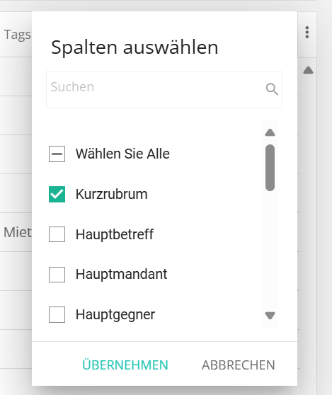 Mit Klick auf die drei Punkte oben rechts am Rand der Liste, öffnet sich ein Menüfenster, in dem Sie auswählen können, welche Spalteninhalte die Aktenliste anzeigen soll. Die Einstellungen, die Sie dabei treffen, werden sitzungsübergreifend übernommen. Das bedeutet, wenn Sie die Aktenübersicht zu einem anderen Zeitpunkt erneut aufrufen, werden die Spalten angezeigt, die Sie zuvor ausgewählt hatten. Klicken Sie nach erfolgter Auswahl auf die grüne Schrift „Übernehmen“.