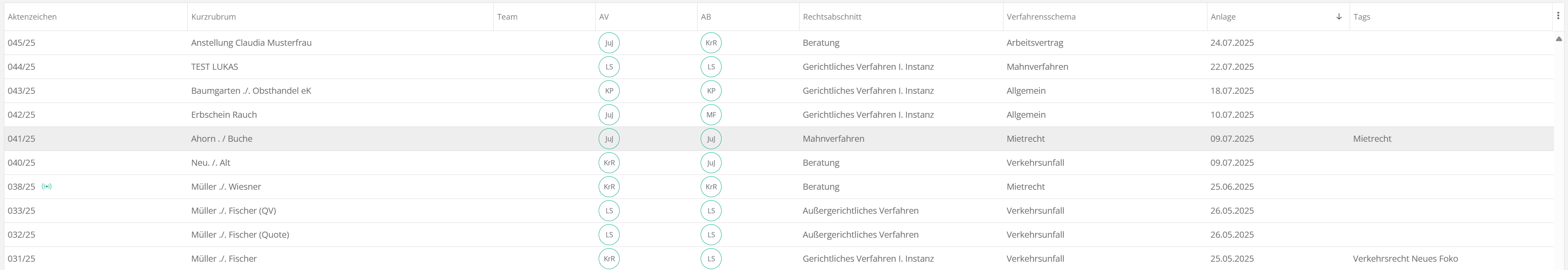 Wählen Sie zunächst über die Filteroptionen bzw. Sortierfunktion die Akten aus, in denen Sie gemeinschaftlich Änderungen vornehmen wollen.