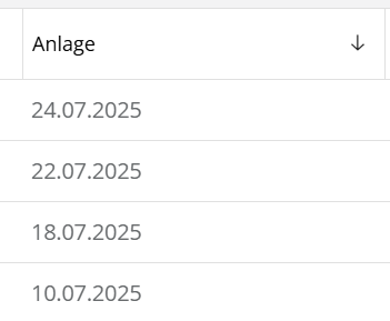 Wenn Sie auf die Spalte mit der Überschrift „Anlage“ klicken, sehen Sie anhand eines kleinen Pfeilsymbols, dass Sie zwischen „von alt zu neu“ oder „von neu zu alt“ sortieren können, also nach auf- oder absteigendem Anlagedatum der Akten. Hier sehen Sie die Sortierreihenfolge mit absteigendem Anlagedatum von neuster Akte zu ältester Akte.