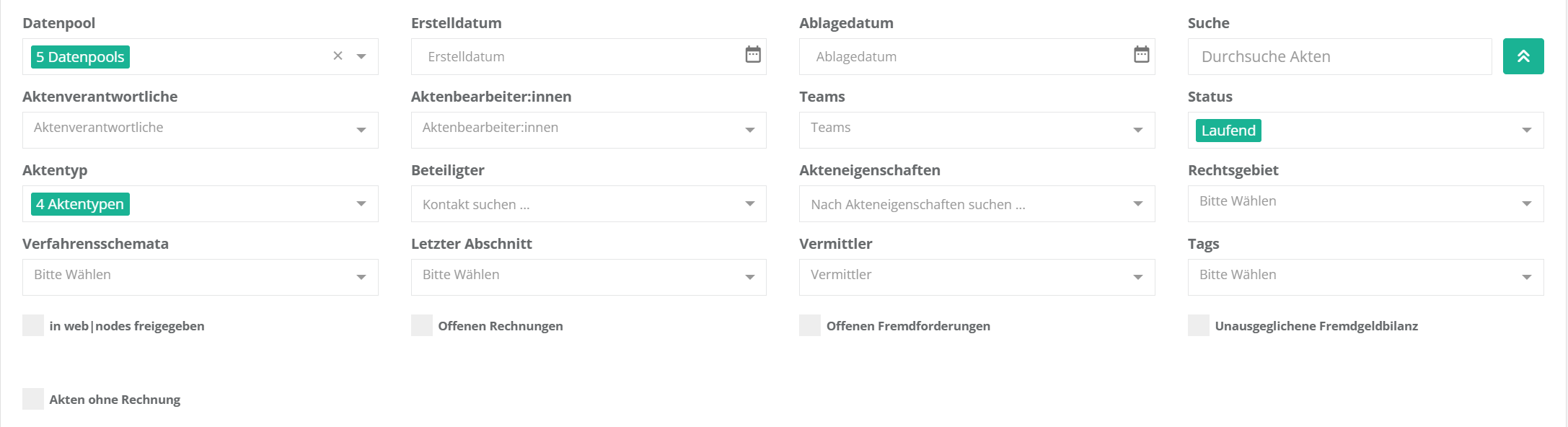 - Status: laufende, archivierte oder ausgeblendete Akten durchsuchen, Mehrfachauswahl möglich