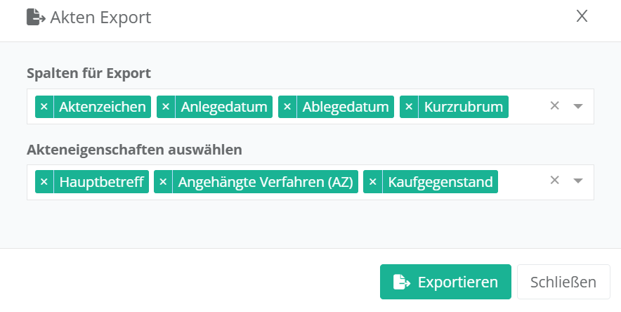 Es öffnet sich ein neues Fenster, in welchem Sie manuell die benötigten Spalten für Ihren Akten-Export festlegen können. Hier eine Beispielansicht: