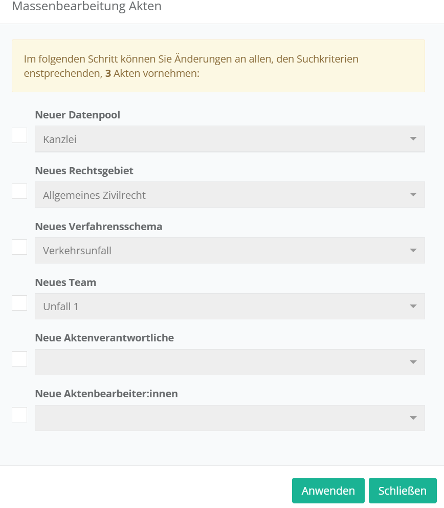 Sie können die ausgewählten Akten nun in einen anderen Datenpool, ein anderes Rechtsgebiet oder Verfahrensschema verschieben. Auch können Sie ein neues Team oder Aktenverantwortlichen / Aktenbearbeiter zuweisen. Dies ist insbesondere dann praktisch, wenn ein Mitglied Ihre Kanzlei verlässt und alle Akten dieser Person auf einen Nachfolger „umgezogen“ werden sollen.