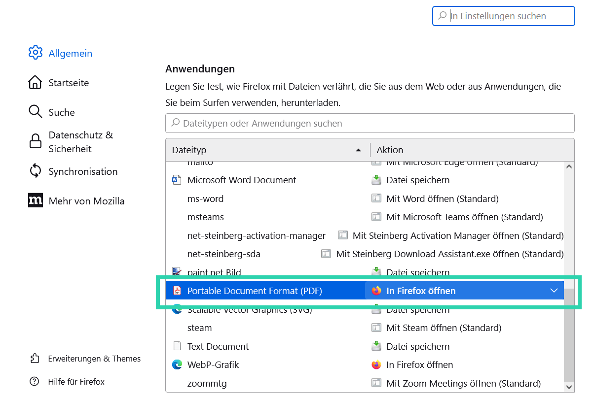 In Firefox kann es zu einem Problem mit der Vorschau von Dokumenten kommen, wenn die Einstellung „Anwendungen > Dateityp > PDF“ auf „Datei speichern“ gestellt ist. In diesem Fall wird keine Vorschau angezeigt.