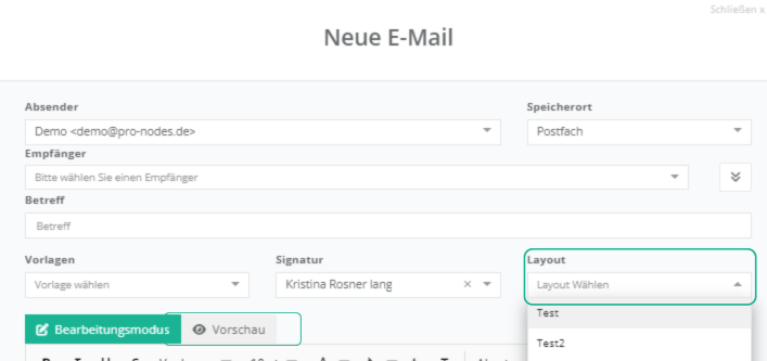 Wenn dies gespeichert ist, können Sie Ihr Layout zukünftig beim Schreiben von E-Mails verwenden. Dafür müssen Sie bei der Erstellung der E-Mails nur das entsprechende Layout auswählen (siehe Screenshot).