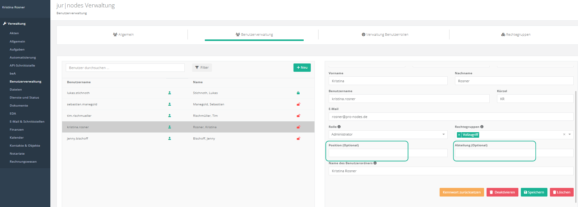 - Die Benutzereinstellungen „Position“ und „Abteilung“ können für jeden Benutzer in der Benutzerverwaltung entsprechend hinterlegt werden: