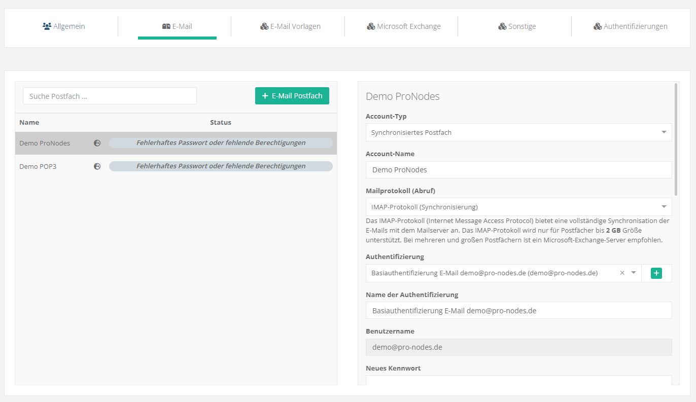- Authentifizierung: Für E-Mail-Postfächer wird eine Authentifizierung benötigt. Lesen Sie mehr zu den in jur|nodes verfügbaren Authentifizierungen.