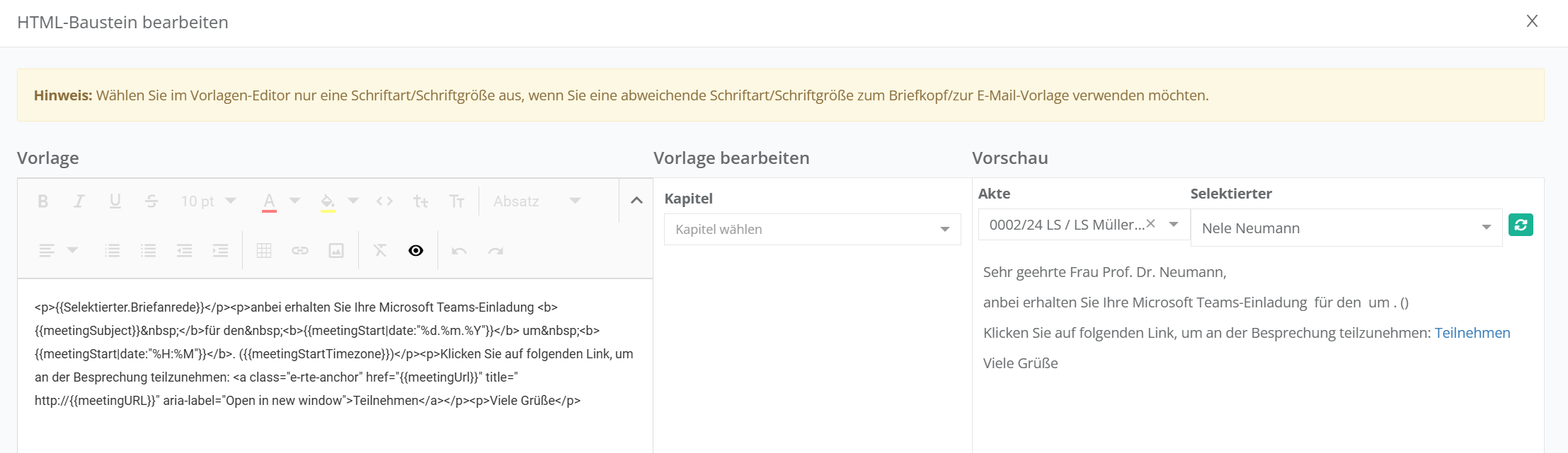 Sie können E-Mail-Vorlagen mit den im HTML-Editor zur Verfügung stehenden Variablen erstellen. Eine Besonderheit hierbei nehmen Vorlagen ein, die Sie zum Versand für MS-Teams-Besprechungslinks versenden möchten. Hierfür steht Ihnen im Bereich „Kapitel“ im Editor aktuell keine Variable zur Verfügung, Sie können jedoch die hier folgende kopieren und als Codezeile in Ihre Vorlage einsetzen: