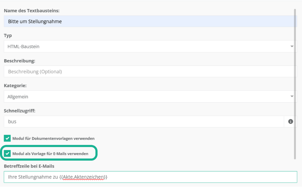 Die Erstellung von E-Mail-Vorlagen folgt der Erstellung von HTML-Bausteinen für Dokumente. Lediglich mit dem Unterschied, dass während der Erstellung das markierte Häkchen in der Checkbox gesetzt werden muss: