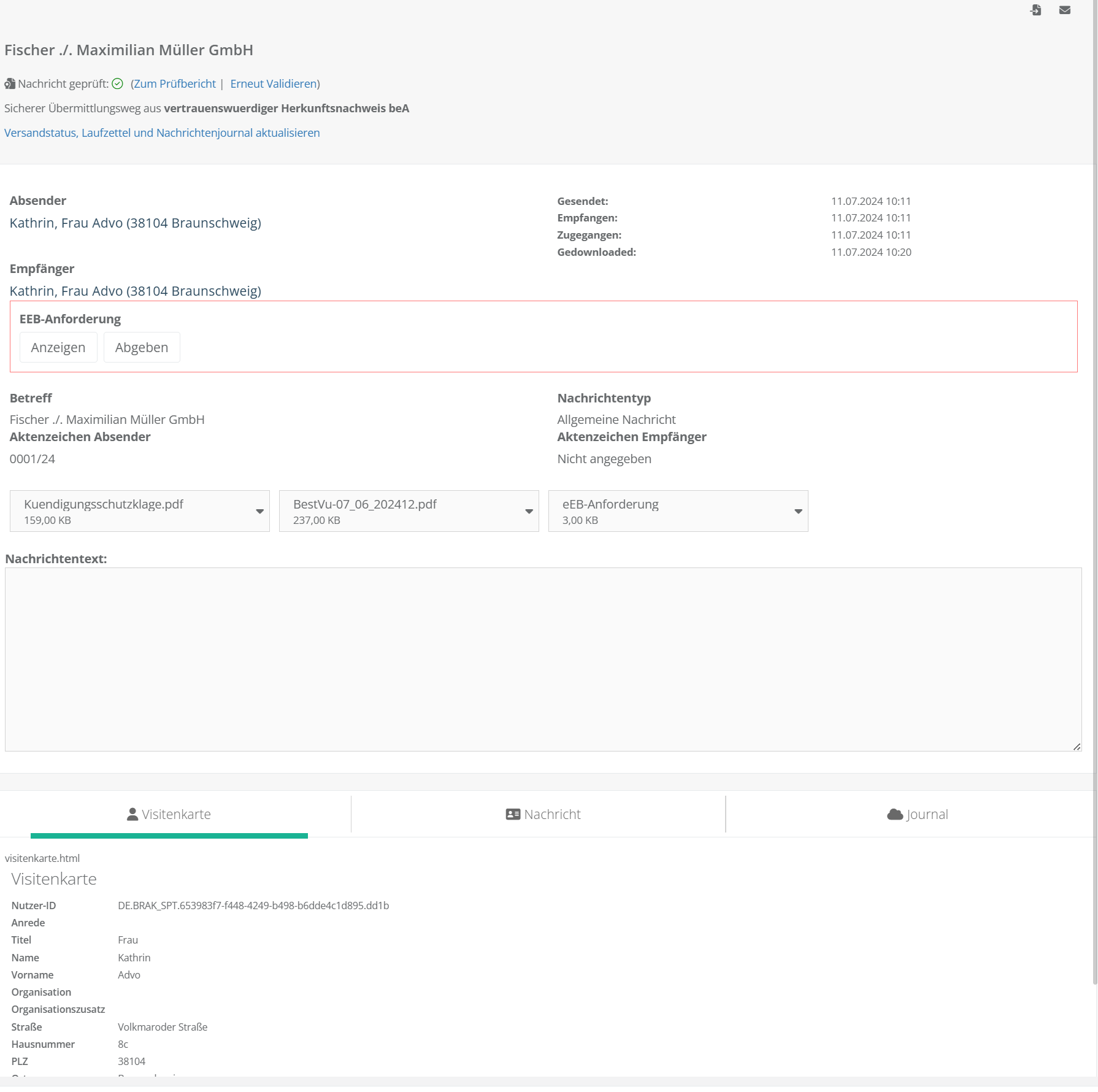 Werden Sie von Gerichten zur Abgabe eines eEB aufgefordert, erscheint ein rotes Kästchen, wenn Sie die beA-Nachricht in jur|nodes öffnen: