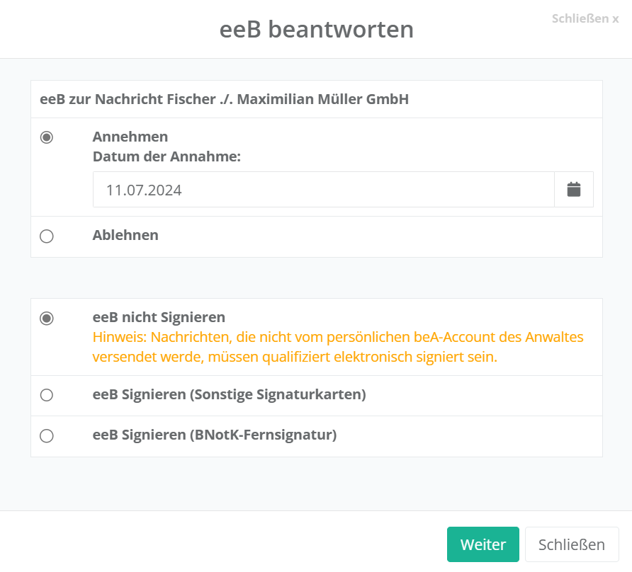 Darüber können Sie direkt aus jur|nodes heraus die beA-Nachricht offiziell annehmen (und damit den eEB-Nachweis versenden), elektronische Signaturen beifügen, oder das eEB ablehnen.