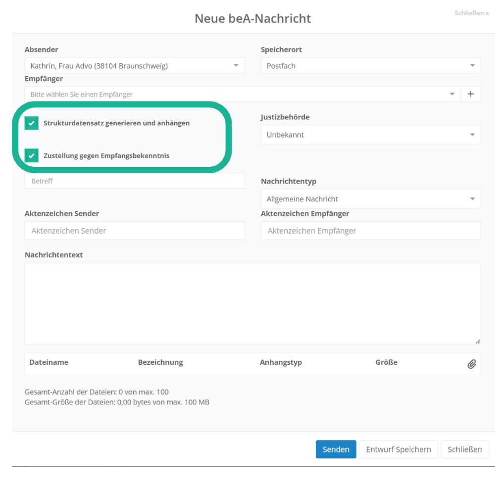 Das Häkchen in der Checkbox „Strukturdatensatz generieren und anhängen“ ist immer ausgewählt. Hierbei handelt es sich um eine xml-Datei, die mit dem Dateinamen „xjustiz_nachricht.xml“ die jede beA-Nachricht automatisch beinhaltet. Sie müssen diese Datei nicht außerhalb der beA-Nachricht speichern. Sie wird automatisch untrennbar an der Korrespondenz direkt gesichert und ist über das Korrespondenzpanel einsehbar.