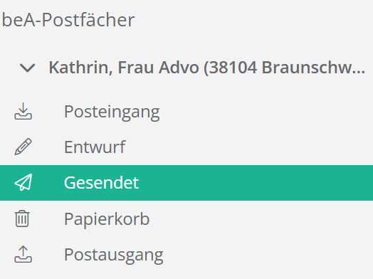 Wenn Sie das eEb aus der Akte heraus abgeben, so wird die Abgabe direkt im Korrespondenzpanel der jeweiligen Akte gespeichert. Geben Sie das eEB aus dem Nachrichtenbereich ab, wird die Abgabe-Nachricht bei den gesendeten Nachrichten des jeweiligen beA-Postfachs gesichert. Sie können diese aus dem Ordner in die jeweilige Akte zuordnen.