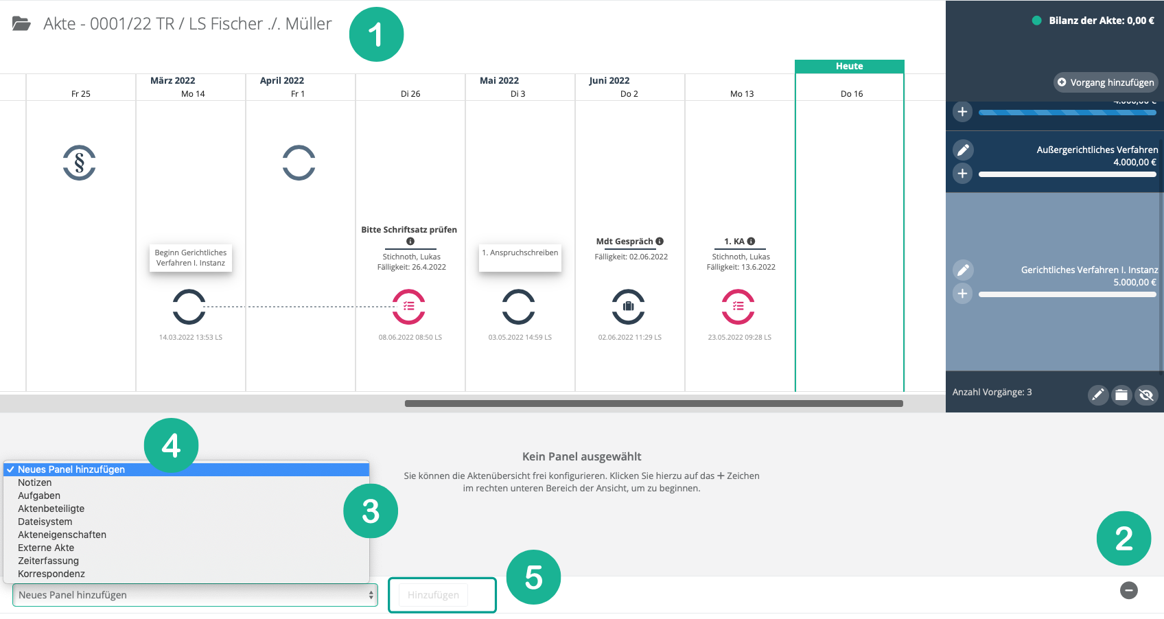 jur|nodes bietet die Möglichkeit die Aktenansicht genau für Ihre Bedürfnisse zu individualisieren. Hierfür stehen Ihnen in der Aktenansicht verschiedene Module sog. „Panel“ zur Verfügung, die Sie nach Belieben hinzufügen und anordnen können.