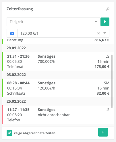 Im Panel Zeiterfassung werden alle der Akte zugehörigen Tätigkeiten mit der aufgewendeten Zeit übersichtlich angezeigt. Es bietet die Möglichkeit, nach noch nicht erfassten Zeiten zu filtern. Zu jeder erfassten Zeit wird angezeigt, ob: