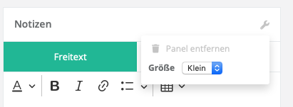 6.) Über den Werkzeugschlüssel in der oberen rechten Ecke jedes Panels lässt sich das Panel entfernen und die Größe der Panel-Ansicht zwischen „klein“ und „groß“ wählen.