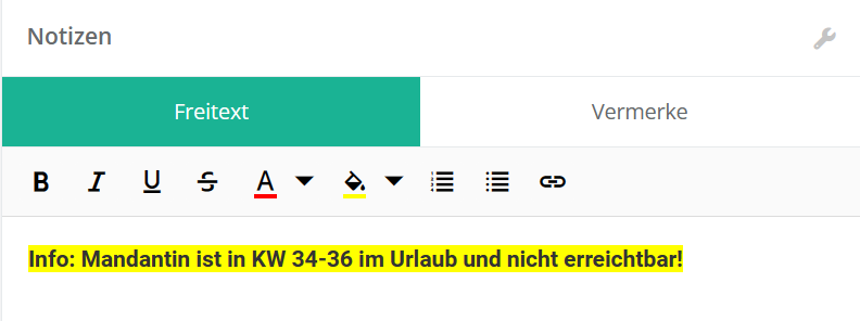Es gibt ein Freitextfeld, in das schnell Notizen eingetragen werden. Das Freitextfeld funktioniert wie ein offenes Word-Dokument: Jeder zugriffsberechtigte Benutzer kann hier Änderungen vornehmen, Notizen hinzufügen oder bestehende überschreiben. Diese werden in Echtzeit zur jeweiligen Akte gespeichert; wenn mehrere Mitarbeitende diese Akte grade geöffnet haben, sehen sie direkt, was der jeweilige Kollege dort einträgt.