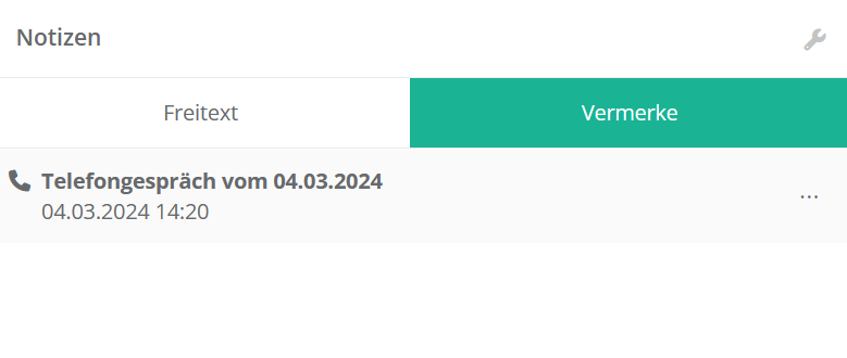 Außerdem gibt es den Vermerke-Bereich. Die hier eingetragenen Notizen werden in der Timeline der Akte einer bestimmten Aktion und einem Datum zugeordnet; sie diesen sozusagen der Protokollierung von z. B. Außerhaus-Termine oder Telefongesprächen. Notizen, die Sie als „Vermerk“ erstellen, werden in der Timeline als auch in diesem Panel chronologisch angezeigt. Anders, als die Freitext-Notizen, können Vermerke nicht nachträglich geändert oder überschrieben werden.