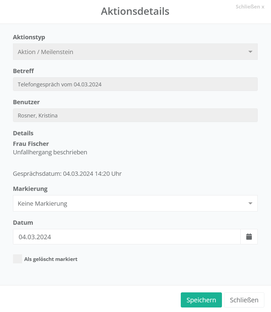 Um die Details eines jeweiligen Vermerks einzusehen, klicken Sie auf die drei Punkte hinter dem Vermerk. Es öffnet sich eine Ansicht namens „Aktionsdetails“, die Ihnen alle eingetragenen Informationen zu dieser Vermerk-Notiz anzeigt.