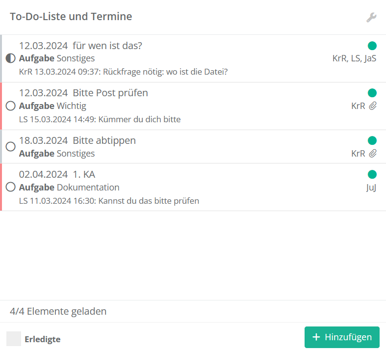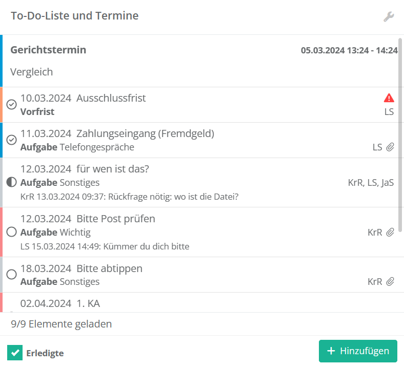 Das Panel „To-Do Liste und Termine“ bietet einen Überblick über alle anstehenden To-Dos. Die farbige Markierung im Panel helfen bei der Angrenzung von wichtigen zu weniger wichtigen Aufgaben und Fristen. Dabei sind Hauptfristen und wichtige Aufgaben immer rot markiert. Erledigte Aufgaben werden blau dargestellt und alle übrigen Termine und Aufgaben erhalten eine unauffällige, graue Markierung.