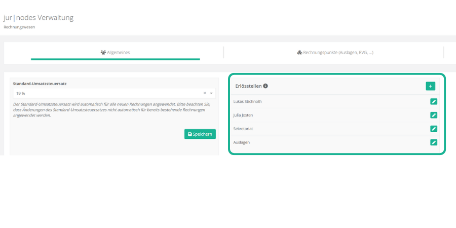 Sie finden die Konfiguration im Bereich „Verwaltung“ unter „Rechnungswesen“ im Reiter „Allgemein“ und dem Panel „Erlösstellen“.