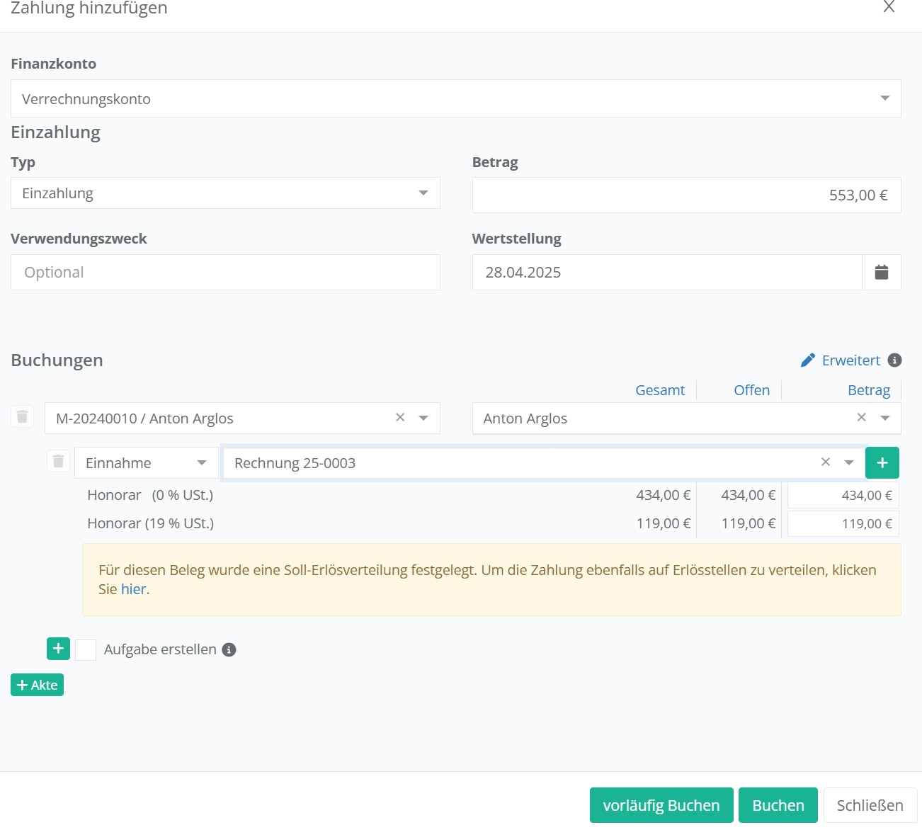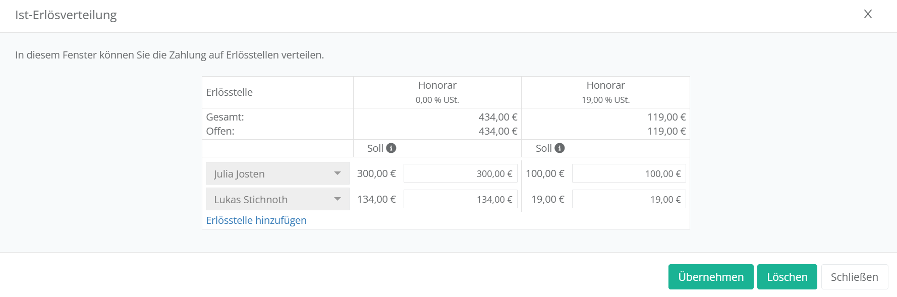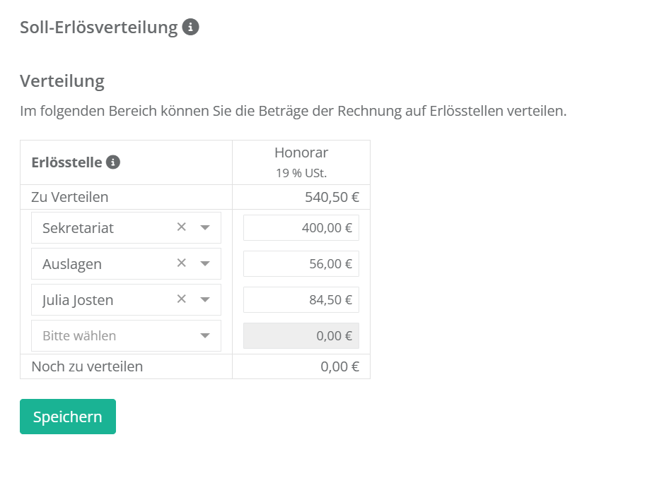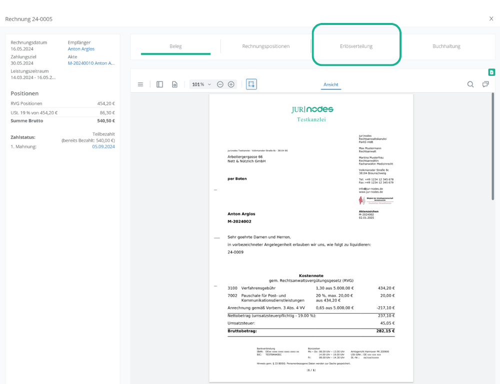 Direkt bei der Erstellung einer Rechnung, oder auch im Nachgang, können Sie in jur|nodes die Verteilung von Erlösen vornehmen. Diese unterteilt sich in die Soll- und Ist-Erlösverteilung.