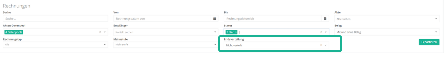 Wenn Sie aktenübergreifend herausfinden möchten, für welche Rechnungen eine Soll-Erlösverteilung noch aussteht, dann können Sie unter „Buchhaltung – Rechnungen“ per Filter dort nach Rechnungen ohne Erlösverteilung suchen.