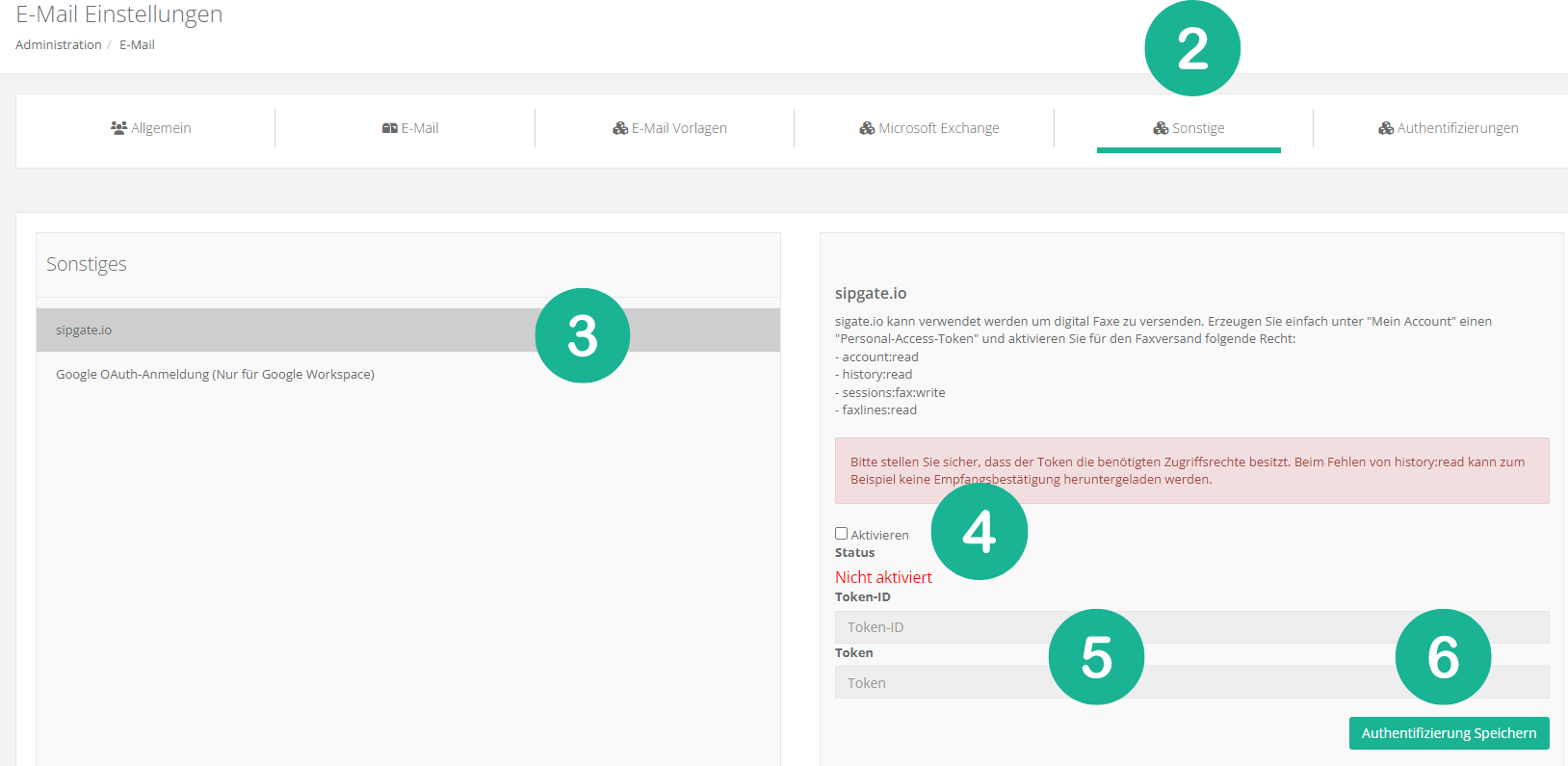 Sie können diesen Token und die dazugehörige Token-ID nun in jur|nodes im Verwaltungsbereich hinterlegen und die Authentifizierung speichern. Dafür befolgen Sie einfach die folgenden Schritte und schon können Sie digital Faxe versenden: